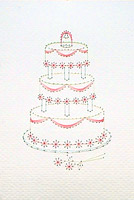 C001 WEDDING CAKE Degree of Difficulty ♥♥ A 3 tier Wedding Cake fully trimmed - with an additional pricking to make it a 2 tier Cake. Stitched in Antique Silver, Pastel Green and Pink Threads on a White Hammered Card. Or use the two tier cake and add initals. |